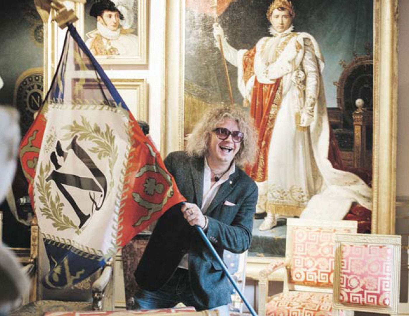 Du sol au plafond, l’appartement parisien de Chalençon est une sorte de temple de style Empire, rouge et or, avec des aigles, des feuilles d’or et partout des abeilles (l’un des emblèmes napoléoniens) sur des vitraux jusque dans les salles de bains. Dans un tiroir du salon se cachent des cure-dents qui viennent du service d’Austerlitz, dont une grande partie est conservée au Musée Carnavalet. Dans un autre, une bouteille de cognac de la garde de Napoléon à Fontainebleau.