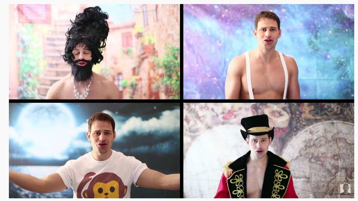 Il présente également de nombreux clips musicaux où le poids de ses vêtements doit parfois se calculer en grammes et où les positions sont souvent des plus lascives. The Greatest showman, combinant une mise en scène romantique où il se présente étendue sur une simili peau d’ours, le cul bien en évidence (avec une prothèse pour en augmenter le galbe) et un livret sur la domination du monde à la main, en constitue un excellent exemple. D’autres, le présente simplement en train de chanter, comme dans le cas de Circle of life (The Lion King) ou, au contraire, dans une vidéo léchée et émouvante comme dans son interprétation de Chandelier.