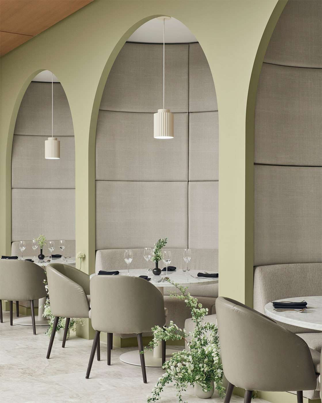 À la fois convivial et enveloppant, le restaurant s’illustre par sa composition qui rappelle les cours intérieures L’éclairage tamisé d’une simulation de puits de lumière suit le rythme du soleil en passant de la clarté vive du matin jusqu’à l’ambiance vaporeuse des fins de soirées. L’espace exclusif du M Club accessible à partir du « Greatroom » vient contraster avec l’esthétique environnante grâce à sa murale de panneaux de bois de noyer et à un choix de couleurs plus