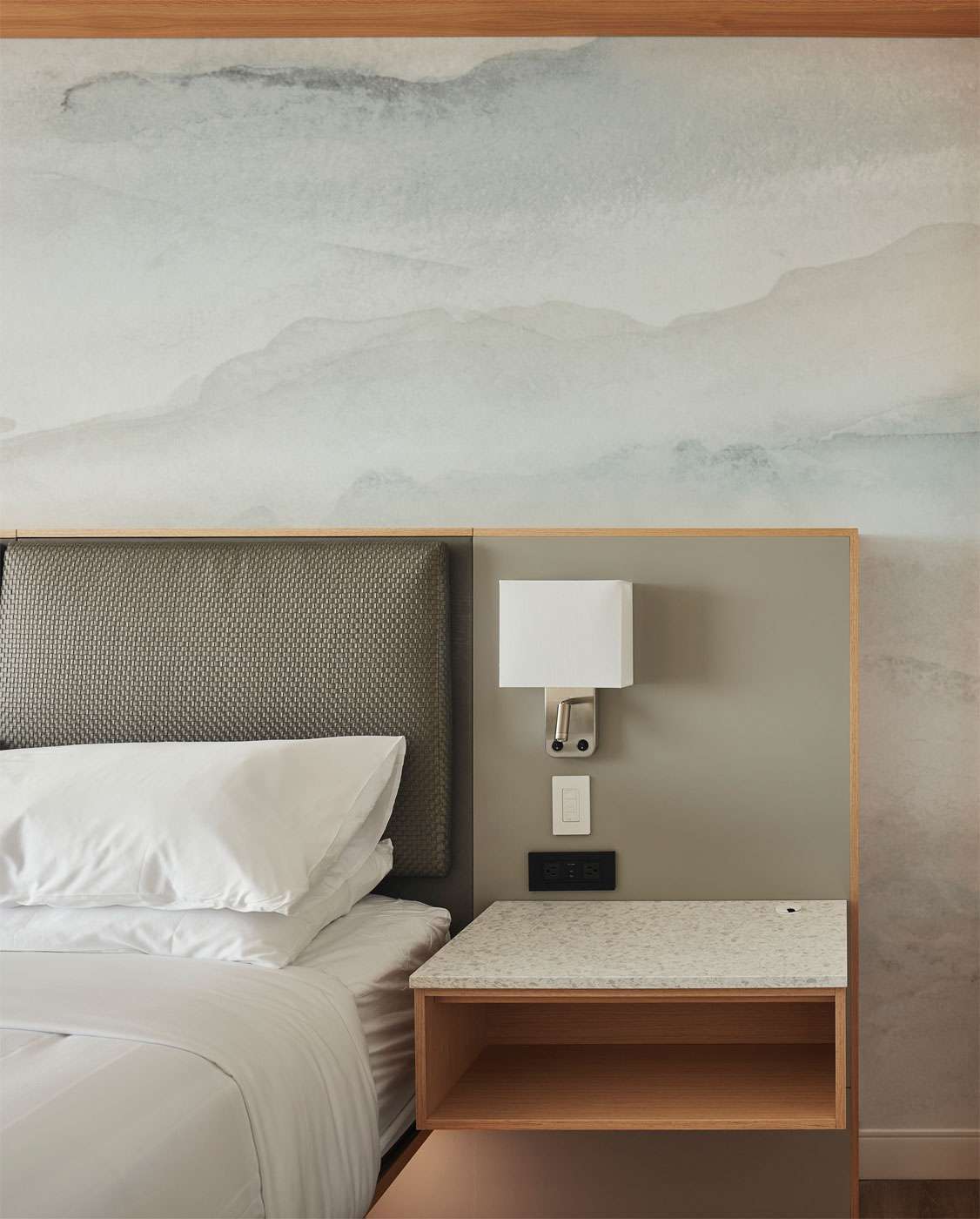 Le défi d’aménagement des chambres réside dans le souhait de préserver l’intégralité des partitions existantes. La cloison séparatrice au centre de la chambre a été repensée de façon à créer un dressing personnalisé, antichambre de la salle d’eau. En conservant une ligne d’horizon au niveau des yeux et en rehaussant la pièce de tons clairs et de finis neutres, la palette esthétique vient désormais mettre l’accent sur la multitude de vues qu’offrent les chambres—que celles-ci dépeignent le Mont-Royal, le Fleuve, le port ou le Centre-Ville. En résulte une version renouvelée et actualisée qui perdurera dans le temps tout en garantissant une expérience reposante et mémorable.