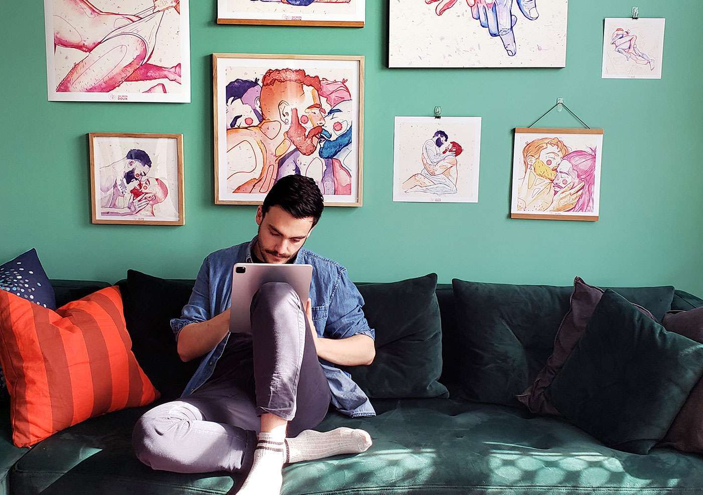 « Depuis octobre 2021 que je me suis vraiment lancé dans ces dessins pour faire de l’art homoérotique, mais avec plein de tendresse, d’amour », explique Sylvain Rolando. « Je voulais exprimer la douceur qu’il y a dans ces relations. J’ai grandi en France, je viens de Marseille et, dans les années 1990, il y avait beaucoup d’homophobie. J’avais en moi de l’homophobie intériorisée. Ça m’aide beaucoup de faire ces illustrations et d’exprimer plus de tendresse. RÉZO m’a beaucoup aidé aussi. Je suis d’ailleurs bénévole aux soirées d’ensachage de condoms de RÉZO. Peut-être qu’éventuellement, lorsque je vendrai plus, je pourrai reverser une partie des fonds à RÉZO… »