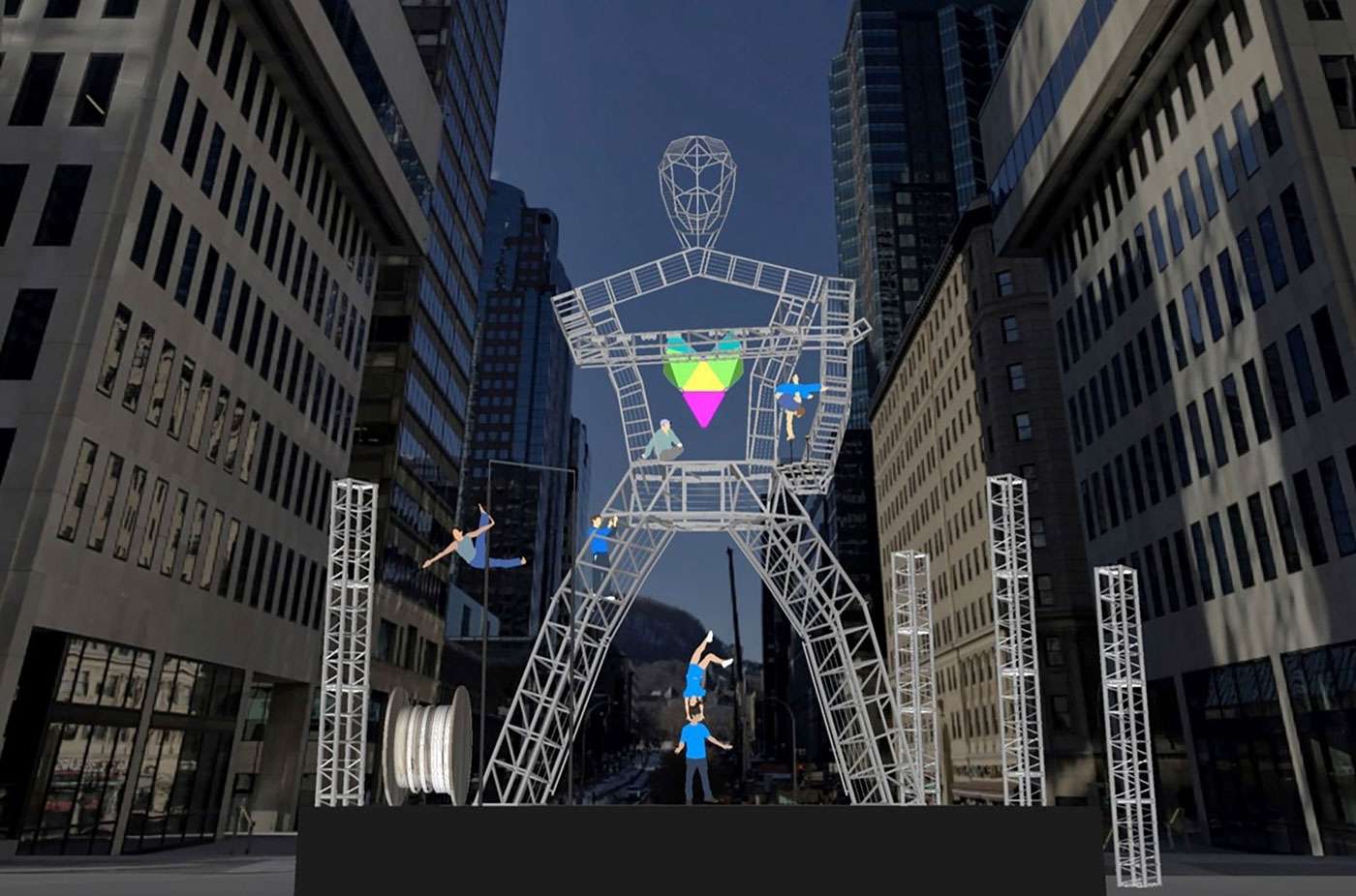 Photo du rendu du Géant à la Place Ville Marie / Crédit photo : Les 7 Doigts