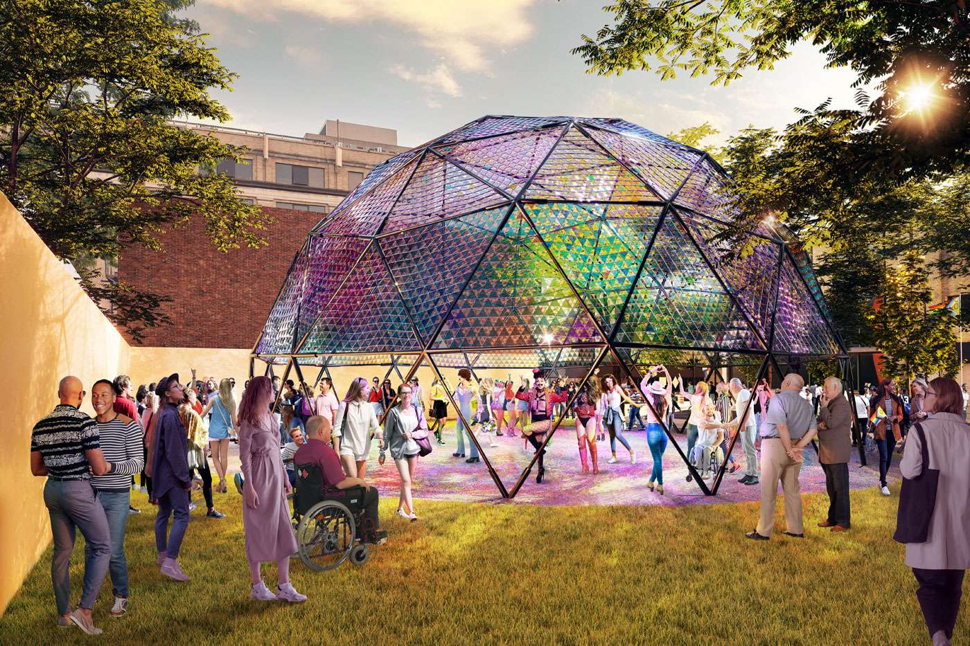 « Nous avons pu compter sur l’expertise et la collaboration de partenaires dévoués pour concrétiser la vision du Village par des aménagements qui répondent à son unicité autant qu’aux besoins de ses communautés, commerçant.e.s, résident.e.s et visiteur.teuse.s. L’arrivée d’un dôme disco géant en plein cœur du Village se veut un lieu de rassemblement privilégié pour accueillir une programmation variée, mais on souhaite aussi qu’il devienne un lieu d’appropriation citoyenne dont toustes profiteront. Que ce soit pour se prélasser avec un livre, manger son repas à emporter d’un commerce local ou encore pour se réunir entre ami.e.s avant une sortie dans le Village, chacune et chacun pourra ajouter sa propre couleur disco à la rue Sainte-Catherine Est ! », ajoute Gabrielle Rondy.