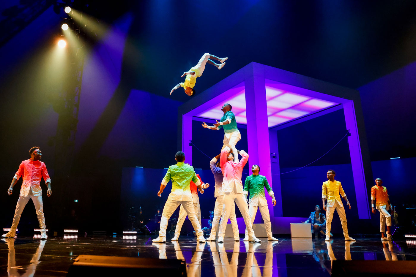 Au niveau de la mise en scène, le show s’articule principalement autour d’un gigantesque cube de 7 m par 7 m qui pave la voie à un large éventail d’acrobaties et de performances théâtrales. Il servira parfois de mur d’escalade, parfois de plateforme de balancement, parfois de surface de projection. Sur papier, le concept peut sembler minimaliste, mais lorsque l’on est assis devant cette superstructure, la magie opère et on est vite subjugué.