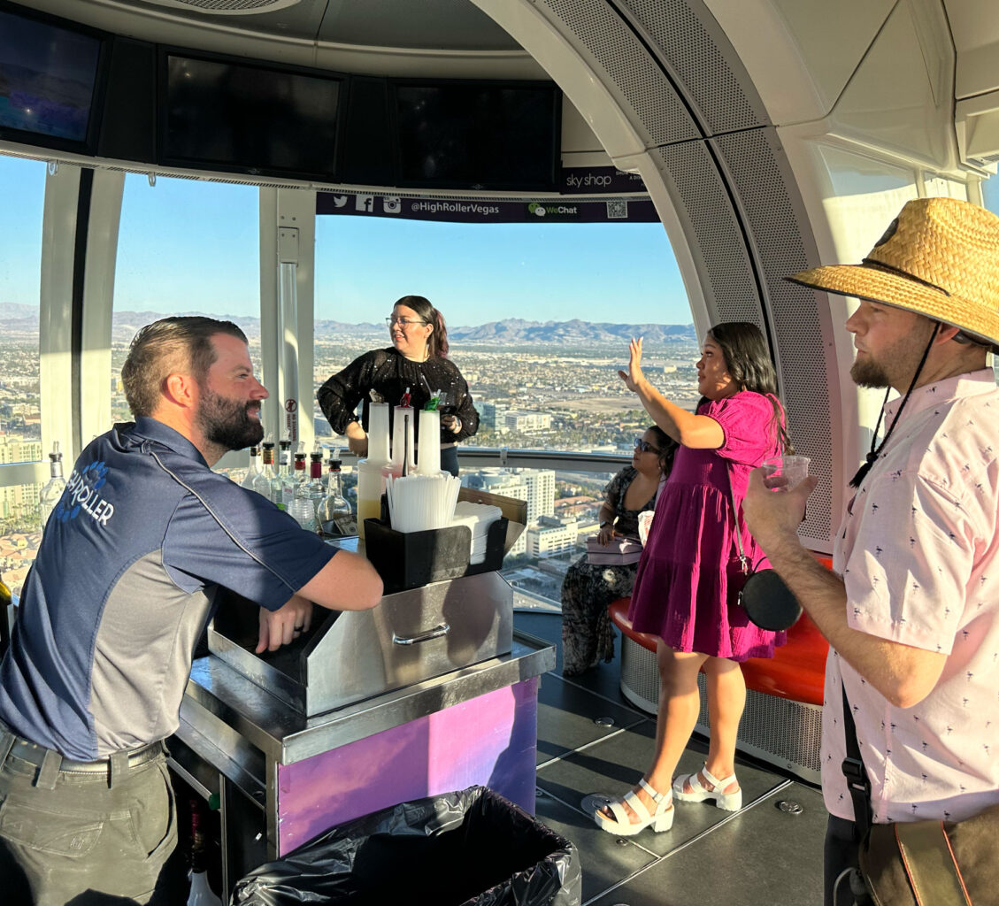 Après avoir laissé ma valise au Planet Hollywood, petite marche sur le Strip en direction nord vers le High Roller de Vegas. Avec une hauteur de plus de 167 mètres, ce n’est pas une grande roue ordinaire. Les cabines sont confortables et vous trouverez même des barmans dans certaines (dont celle où je me trouvais aux côtés d’un petit groupe de journalistes LGBT+). Pendant une révolution de 30 minutes, j’ai pu admirer avec mes collègues le paysage de la ville et voir de haut la nouvelle attraction de Vegas, la Sphère. Si c’était à refaire toutefois, j’opterais pour un tour de fin de soirée pour voir la ville scintiller de toutes ses lumières.