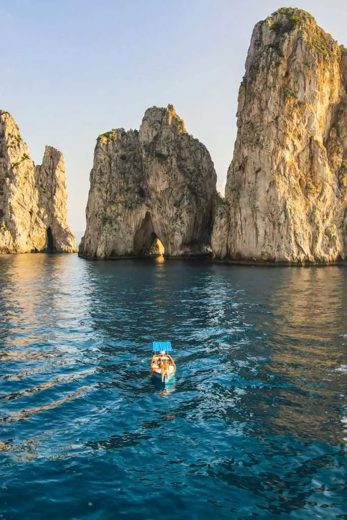À Capri, les grottes et les falaises font partie du paysage de cette seule du golfe de Naples à ne pas être volcanique. Percée de nombreuses cavités, Capri abrite la fameuse Grotta Azzura (grotte bleue), un gouffre sous-marin situé au nord-ouest de l’île dont les reflets bleu cobalt semblent presque fluorescents. Mais il existe bien d’autres grottes à Capri, moins achalandés et tout aussi belles. Pour les découvrir, l’idéal est de faire le tour de l’île en Gozzo, bateau de pêcheurs traditionnel, l’occasion d’admirer les nombreux rochers qui se dressent dans la mer. Les plus célèbres sont les Faraglioni, trois majestueux pics calcaires détachés de l’île par l’érosion, qui sont malheureusement menacés par la pêche à la dynamite (pourtant interdite).