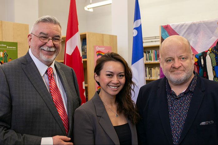 Légende photo : Autour de l’honorable Rechie Waldez ministre fédérale des petites entreprises, Yves Guérin Directeur du projet »Fierté des entrepreneur.e.s 2ELGBTQI+ du Québec» (à droite) et Thierry Arnaud Président de la Chambre de Commerce LGBT du Québec (à gauche) lors de la conférence de presse du 20 février 2025. Crédit Photo : Richard Kim.