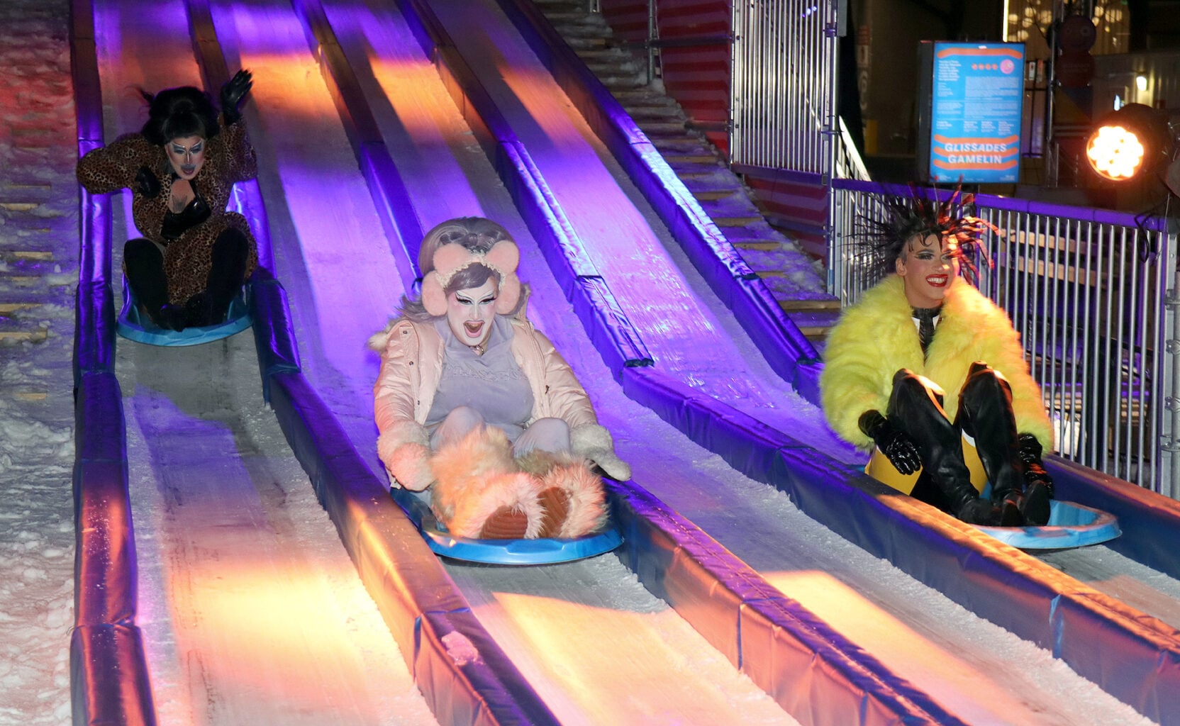 Sami Landry à l’animation des Olympiades Gamelin. Eva Moist s’entraine avant la première descente. Sissi Superstar file vers la victoire contre Eva Moist et Kiara. Lady Magpie et Kiara.