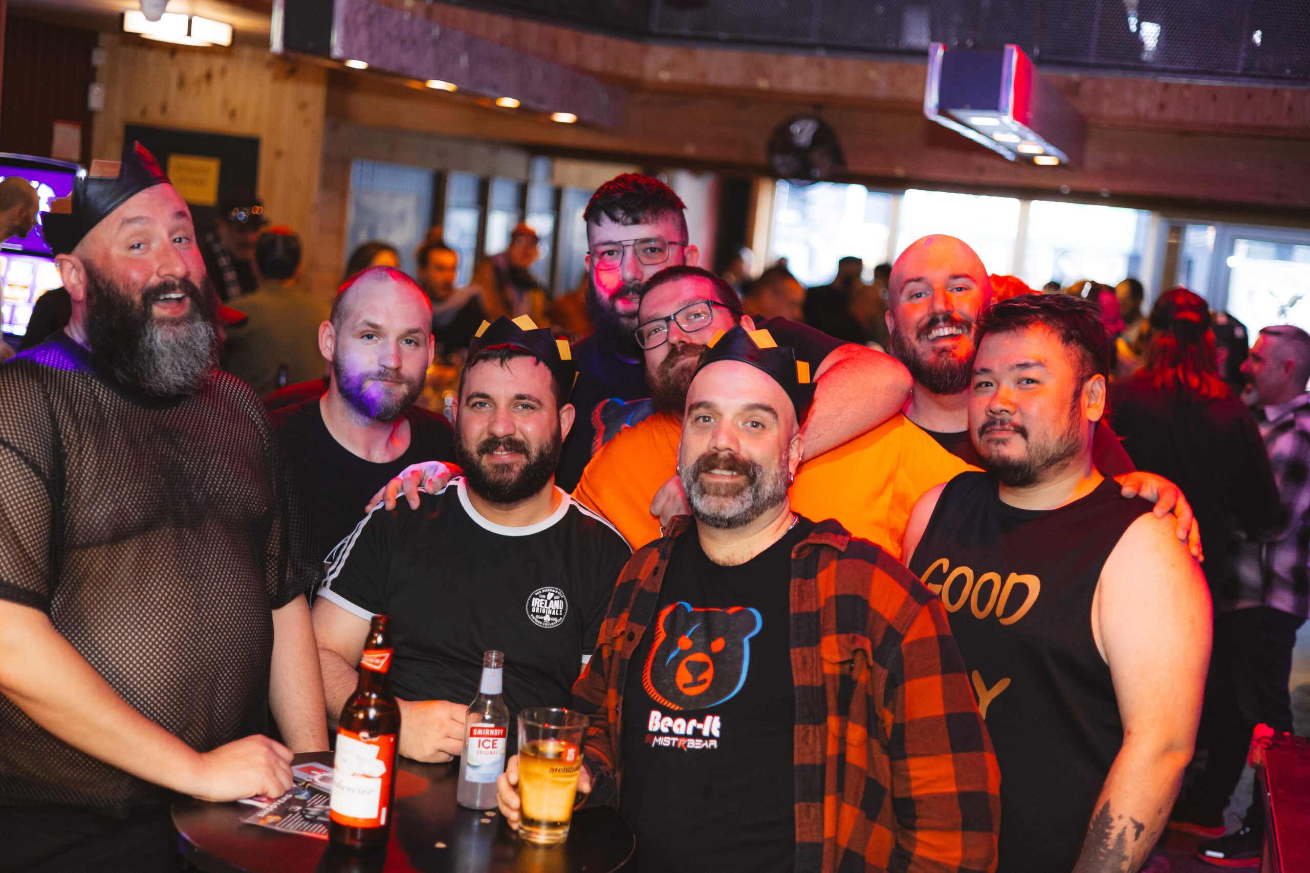 Les Ours réunis lors du Sugar Bear Weekend. Chris, Eric et Julien membre du C.A. de Bear it et Alex concurrent au concours M. Ours. Un bon BlowJob Shooter pour Axel. Les propriétaires du Bar Aigle Noir, Lucien & Alexandre avec Sally-D, puis avec leurs barman.