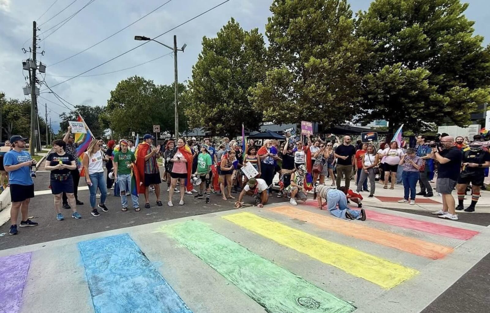 Plus d’une centaine de militants LGBTQ+ et alliés ont manifesté vendredi en recolorant de craie un passage piéton arc-en-ciel effacé par les autorités devant l’ancien club Pulse, théâtre de la tuerie de 2016 qui avait coûté la vie à 49 personnes.