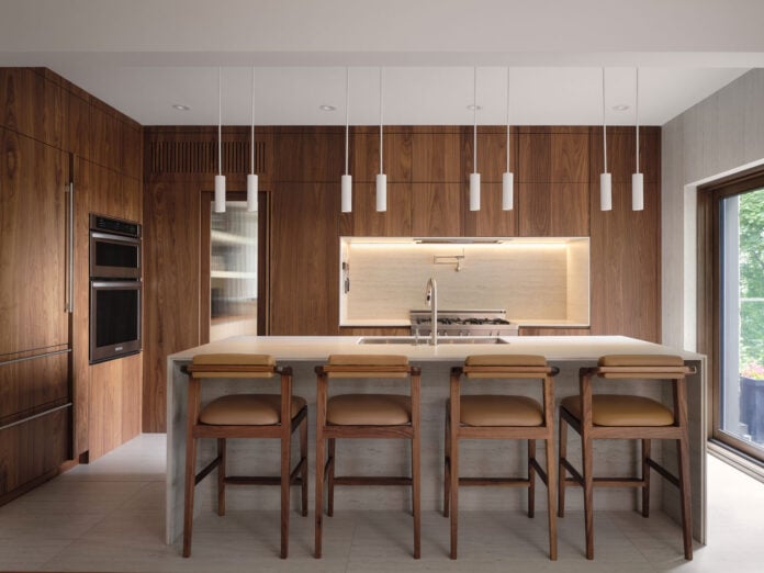 Le projet s’appuie sur une recherche d’unité et de cohérence, autant dans la palette que dans la composition. Le dialogue entre les tons de travertin clair — utilisés pour les planchers, les murs et l’îlot de cuisine — et le noyer richement veiné instaure une atmosphère chaleureuse, apaisante, presque méditative. Chaque matériau a été choisi pour ses qualités sensorielles et sa capacité à interagir avec la lumière naturelle, qui traverse généreusement les nouveaux percements pratiqués dans la façade arrière. L’esthétique globale découle d’une orchestration précise, allant du traitement des lignes jusqu’aux luminaires sur mesure, qui rythment l’espace avec une éloquence discrète.
