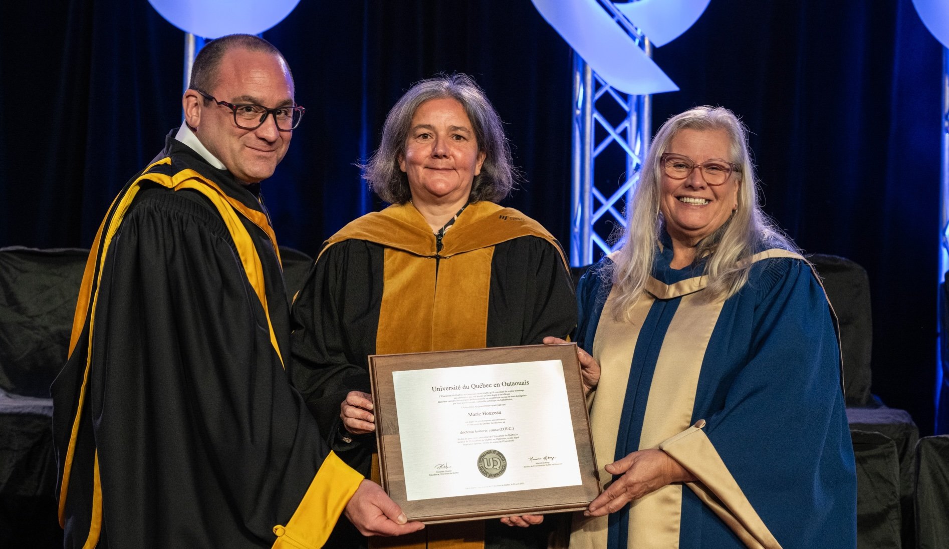 « C’est avec beaucoup d’humilité que je reçois cette reconnaissance qui met en lumière l’indispensable alliance entre l’académique et le communautaire », a déclaré Marie Houzeau lors de la cérémonie. Murielle Laberge, rectrice de l’UQO, a voulu souligner pourquoi son université a tenu à lui rendre hommage : « Un doctorat honoris causa est remis à des personnes qui, par leur vision, leur dévouement et leur bienveillance, changent profondément le visage d’une société. Marie Houzeau fait partie de celles-là. »