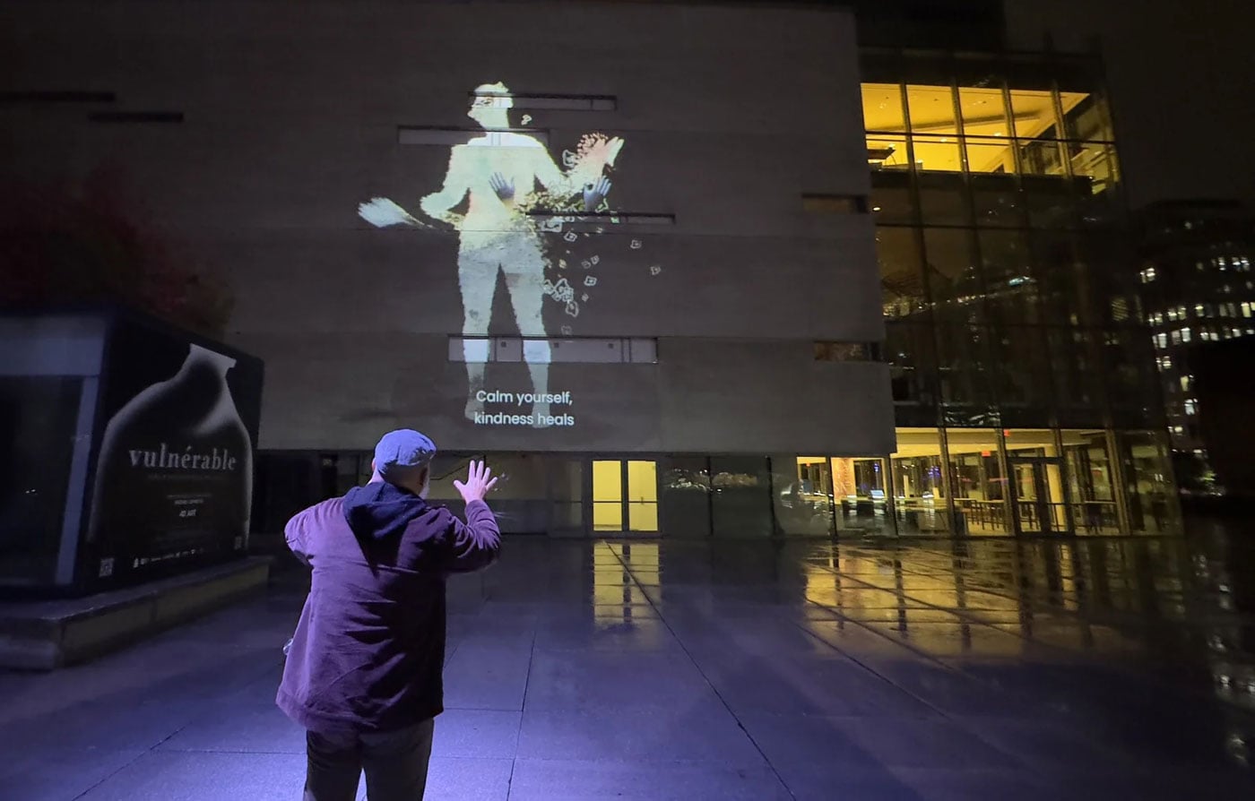 Artiste multidisciplinaire, Michel Lemieux ne cesse de surprendre. Entre les déploiements géants de projections sur les murs de la ville, il crée aussi des œuvres plus intimistes, moins grandioses mais tout aussi percutantes. C’est le cas de Vulnérable, une installation interactive qui explore les conséquences de la violence — quelle qu’elle soit — sur celleux qui en sont victimes.