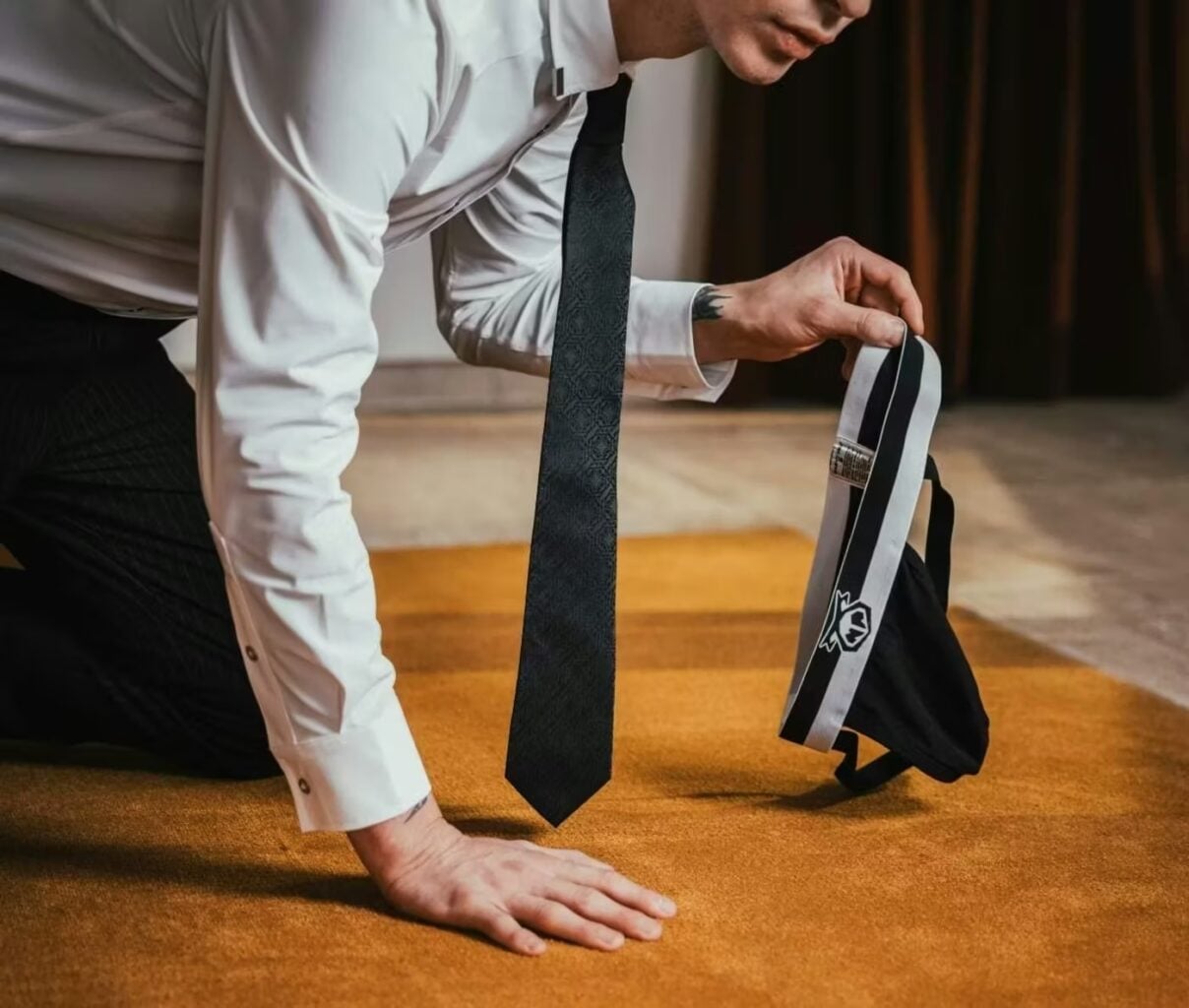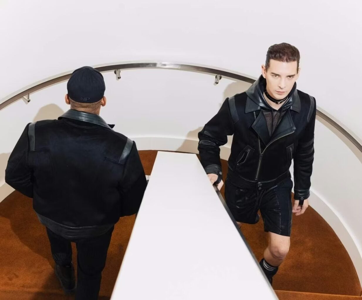 “Mergers & Acquisitions” présente plusieurs pièces phares de la collection hivernale, dont une garde-robe qui navigue entre formalité et désir brut : La Trade Dress Shirt, une chemise ajustée avec coutures façon harnais et détails métalliques; La Snout Necktie, une cravate tissée subtilement du logo de la marque; Le Trade Pant, qui ajoute une touche corporate sans perdre l’attitude Nasty Pig. Lauterstein met aussi de l’avant le Logan Jacket, une réinterprétation éditoriale du perfecto, confectionnée en laine et cuir, avec des coutures complexes et une demi-fermeture éclair qui raccourcit élégamment la silhouette.