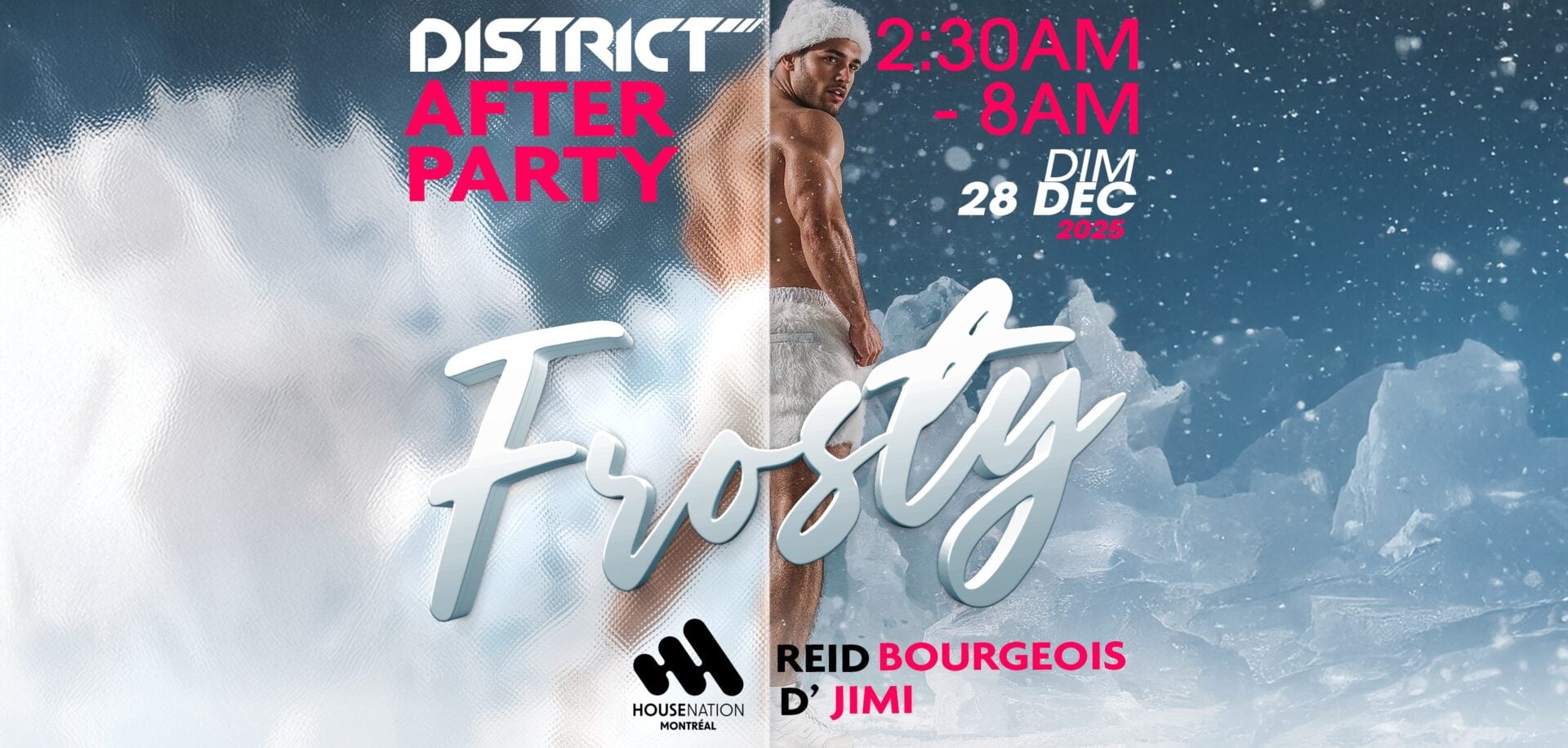 👑 Frosty After Party En collaboration avec House Nation Mtl, après le Frosty, vous pouvez continuer la fête, le dimanche 28 décembre, de 2 h 30 à 8 h, au Frosty After Party. Les DJ Reid Bourgeois, un habitué des Districts et D’Jimi seront de la partie pour vous faire danser jusqu’aux petites heures du matin. Au 917, rue Sainte-Catherine Est, Montréal. Billets pour le Frosty et pour le Fresh After Party.