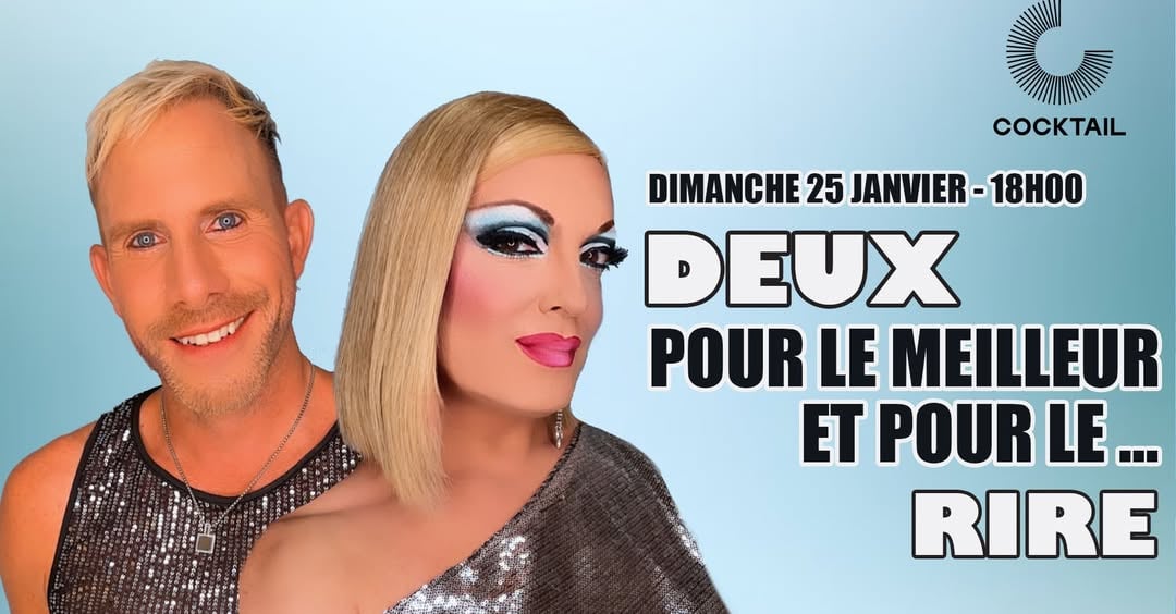 Préparez-vous à rire, à chanter et à être complètement charmés par DEUX pour le meilleur et pour le… RIRE ! Ce spectacle met en vedette l’incomparable duo Michel Dorion et Jean-Marc Reid, deux artistes dont la complicité n’est plus à prouver. Déjà acclamés pour leurs performances mémorables dans Les Succès Oubliés, ils reviennent cette fois avec un tout nouveau spectacle à deux, encore plus divertissant, encore plus éclaté, et surtout… encore plus drôle ! Au programme : Une série de duos irrésistibles; Des performances qui vous en mettront plein la vue; Une avalanche de rires. Dimanche 25 janvier à 18h, à Bar Le Cocktail. C’est LA soirée à ne pas manquer ! Venez vivre un moment unique en compagnie de deux artistes exceptionnels qui sauront vous faire passer un moment inoubliable.