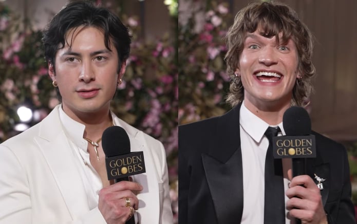 Avant même le début de la cérémonie, Hudson Williams et Connor Storrie alimentaient déjà la machine à mèmes sur le tapis rouge. En entrevue avec l’animatrice de CBS Mornings Gayle King, Williams a lancé une blague délicieusement ambiguë à propos des scènes sexuelles — disons… explosives — de la série. King racontait que, la veille, lors d’une fête pré-Golden Globes, tout le monde attendait leur arrivée avec fébrilité. « Le buzz toute la soirée, et je n’exagère pas, c’était : “Ils vont venir Ils vont venir! Ils vont venir!” (They are coming, they are coming, They are coming)»