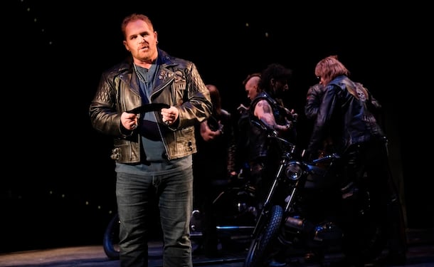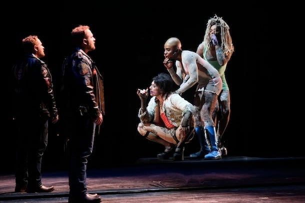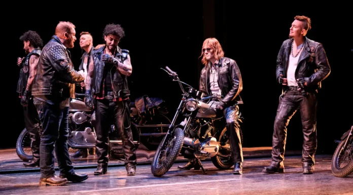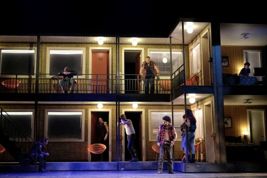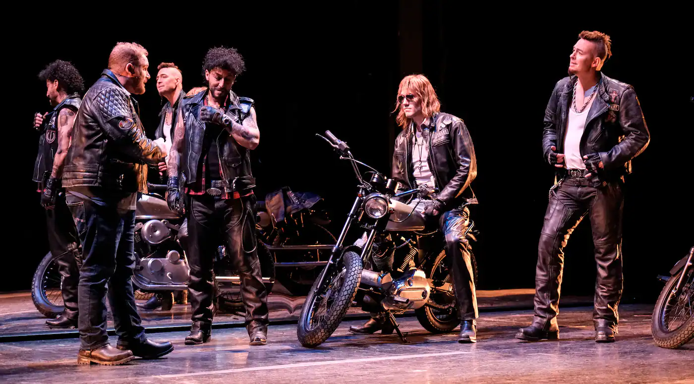 Nous sommes dans le monde des motards, les vestes de cuir incrustées d’emblème, les cheveux longs. Même les motos nombreuses feront des cercles sur la scène. Et bien sûr un motel, rendez-vous des bandes du crime organisé. Les comédien.ne.s sont remarquables même si parfois on frôle la caricature ou le grotesque. En somme, les motards deviennent des images d’Épinal pour souligner leur réalité. Violette Chauveau en Lady Macbeth, devenue simple femme d’un chef de gang, est irrésistible même si l’on aurait aimé parfois un peu plus de retenu dans son jeu.