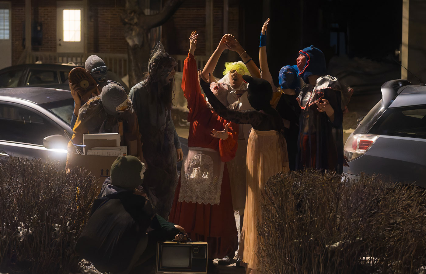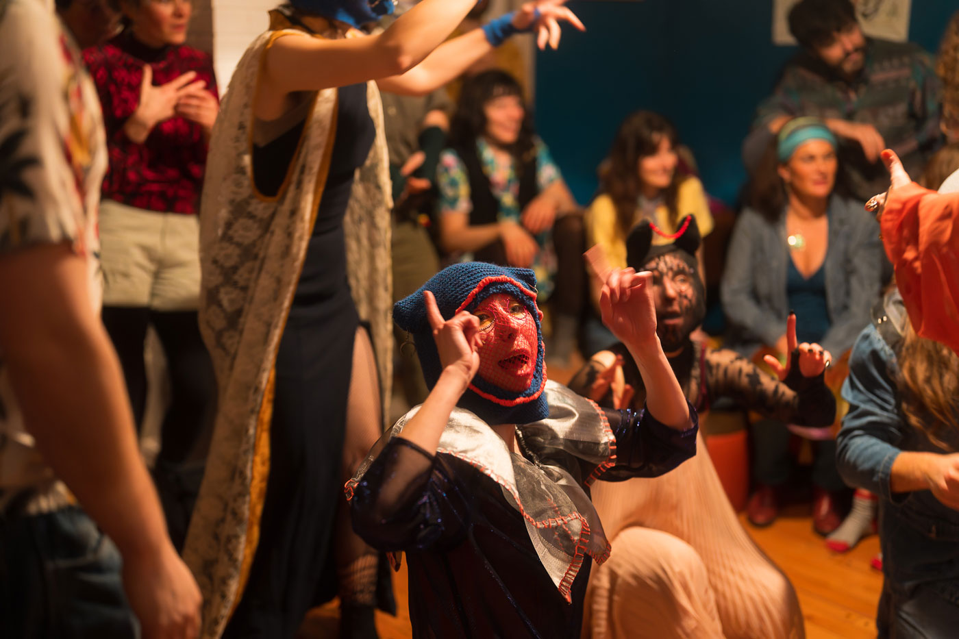 « Faire une pause du carême, c’est faire une pause de tous les diktats et tout ce que ça représente », y compris les diktats de genre, mentionne la co-organisatrice Klo Rancourt-Maltais. « Pour une soirée, on peut être quelqu’un d’autre, ou être son vrai soi. C’est éminemment queer, à cause de ça. » Avec la Révolution tranquille, le bruit des soirées costumées cachées s’est estompé peu à peu au Québec. « Quand les gens ont cessé de faire le carême, ils voyaient moins la pertinence de faire une pause à quelque chose qu’ils ne faisaient plus », dit Flo. La tradition perdure dans quelques communautés isolées, dans Charlevoix, sur la Côte-Nord, aux Îles-de-la-Madeleine et en Acadie. Pour faire renaître la tradition à Rimouski, les organisateur.trice.s ont d’abord dû expliquer ce que c’était — à part quelques personnes avec des proches aux Îles, peu de gens en avaient entendu parler. Mais une fois les explications données, « tout le monde a embarqué », dit Flo Mailhot-Léonard, qui, comme ses co-organisateur.trice.s, est aussi impliquée dans l’organisation du FestiQueer. Le groupe a eu peu de difficulté à recruter une demi-douzaine de personnes pour accueillir une joyeuse fanfare costumée chez eux et une trentaine d’artistes.