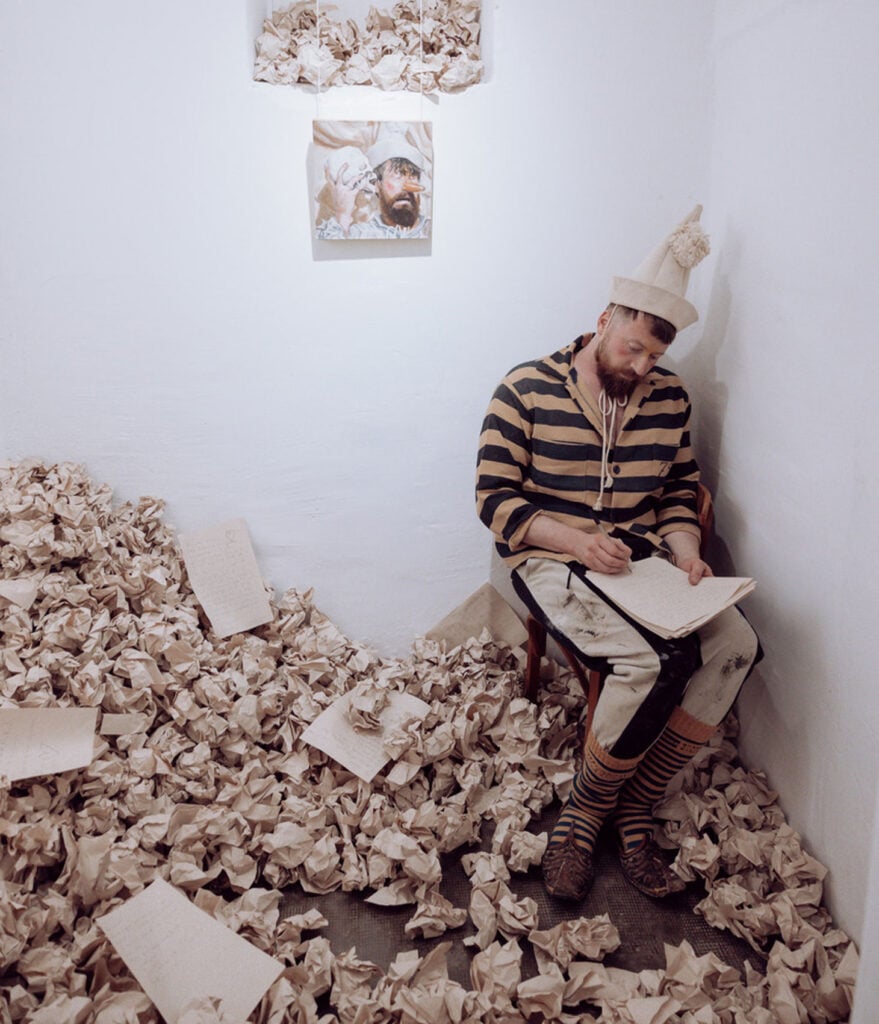 Je me suis demandé ce qu’un clown ferait s’il était emprisonné au bout du monde dans une cellule. Ma première idée : il écrirait des lettres d’amour. J’ai décidé d’en écrire à l’infini jusqu’au lendemain. Je suis parti vers la ville pour trouver du papier à lettres. Dans une boutique de cadeaux touristiques, j’ai vu l’ancien chemisier de prisonnier officiel pour compléter mon costume de clown. Je me suis installé dans la cellule pour écrire des lettres durant huit heures. Je les mettais en boule et je les lançais dans la cellule pour créer un volume. J’ai fini dans un océan de papier avec plein de mots d’amour clownesques à mon chum et à un chum symbolique.