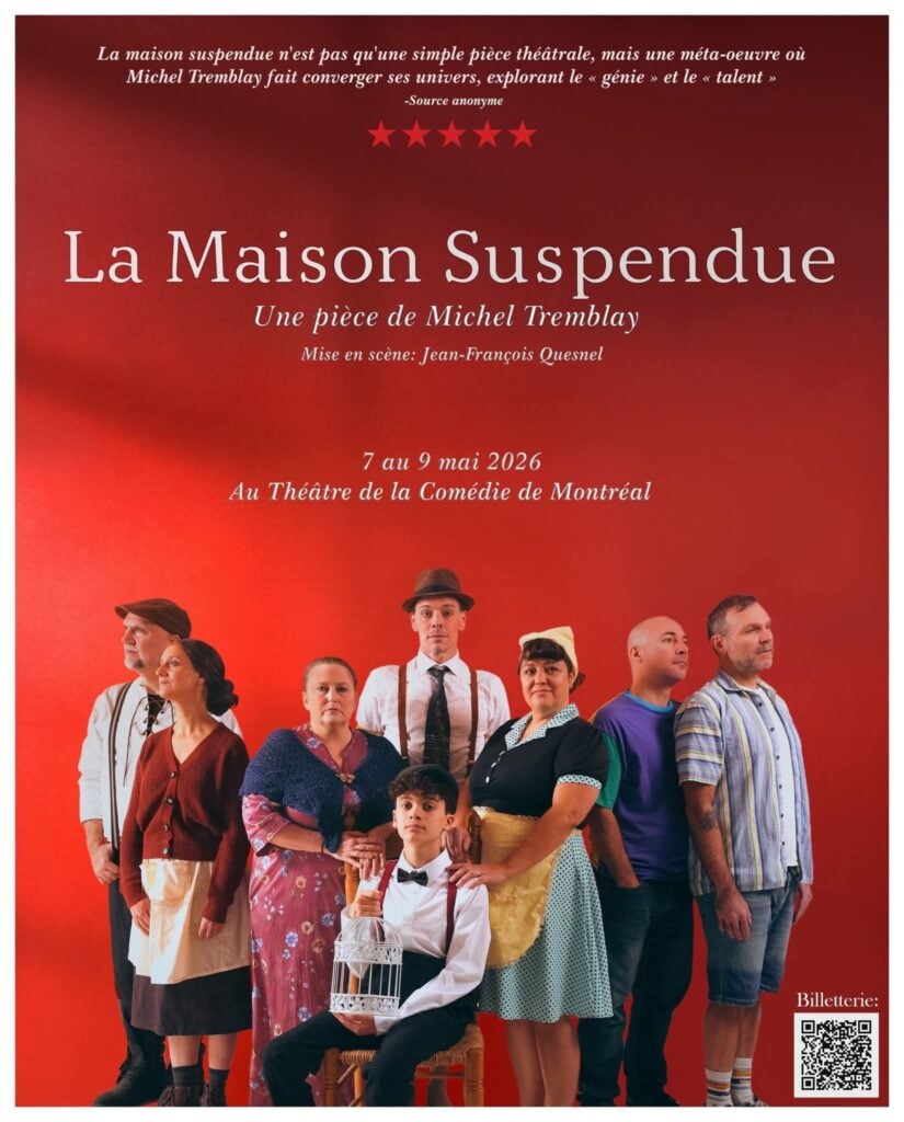 🎭 La Maison suspendue de Michel Tremblay La maison suspendue de Michel Tremblay. Mise en scène Jean-François Quesnel. Résumé : Un couple, Jean-Marc et Mathieu, vient passer ses vacances d’été avec le fils de ce dernier, Sébastien, 11 ans, dans un chalet des Laurentides, autrefois maison familiale. En ouvrant la porte, Jean-Marc retrouve ses racines. La maison de 1910 vibre à nouveau aux accents du conteur Josaphat-le-violon et aux anxiétés de sa compagne et sœur Victoire, qui ne veut pas partir pour la ville afin d’éviter à leur fils Gabriel de grandir loin de la nature. La maison de 1950 tremble sous les affrontements d’Édouard, qui accepte de vivre sa marginalité sexuelle à l’aide du rêve, et de sa sœur Albertine, qui refuse l’imaginaire dans sa vie. Jean-Marc arrivera à réconcilier le passé familial et sa nouvelle famille.à La Comédie de Montréal le 7-8-9 mai 2026 !!Achetez vos billets maintenant.