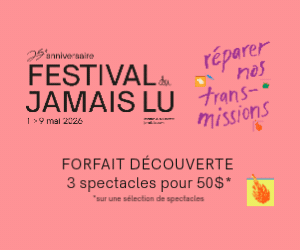 🎭 25e édition du festival Jamais Lu, le rendez-vous incontournable pour découvrir les écritures qui feront le théâtre de demain! Des auteurices, mais aussi des acteurices et metteur.euses en scène, dont : Lyraël Dauphin, Jean-Paul Daoust, Xenia, Louis-Karl tremblay, Dany Boudreault, … et plusieurs autres. Du 1er au 9 mai, Théâtre Aux Écuries.